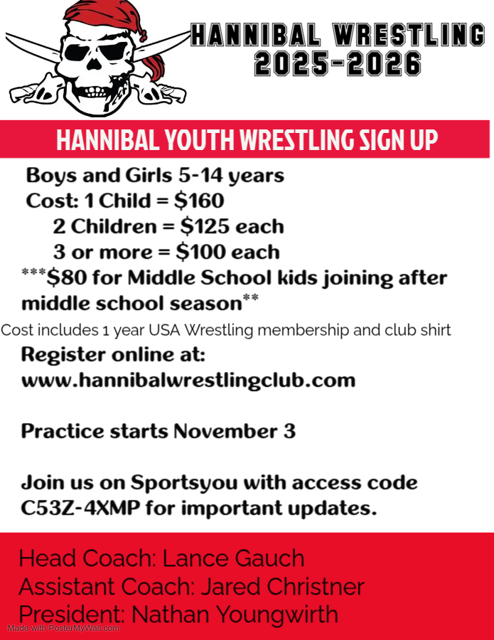 Jared lives here in Hannibal and has 2 children of his own and lives with his girlfriend who has 4 children, one of which is Brantley who wrestles for Hannibal Wrestling Club. Jared currently works in Sales for Traeger.